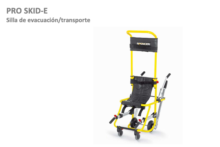 Las sillas para bajar escaleras Pro Skid-E son dispositivos que se utilizan para mover y llevar a un paciente a una posición sentada en la ambulancia, pero no para transportar al paciente dentro de la ambulancia. Están equipados con toboganes que ayudan al descenso de las escaleras para reducir el esfuerzo requerido por el operador durante el traslado del paciente y la silla. No deben utilizarse para estacionamiento.
