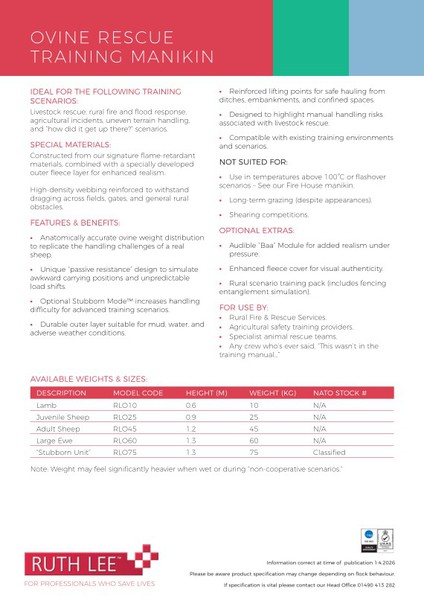 El maniquí ha sido diseñado de tal manera que es posible bloquear sus piernas, lo que significa que puede estar sin apoyo en sus propios cascos; Esencial para muchas situaciones de entrenamiento de rescate, particularmente aquellas que implican atrapamiento de agua y barro.