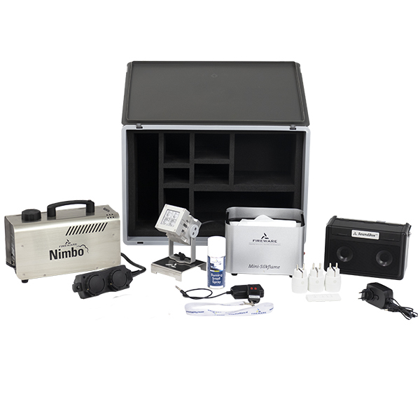 Contiene un FireWare Mini-Silkflame, un FireSpot con soporte de suelo, un mando a distancia Click On/Off, la máquina de humo FireWare Nimbo y un mando inalámbrico, la SoundBox V3, un FireWare Burning
